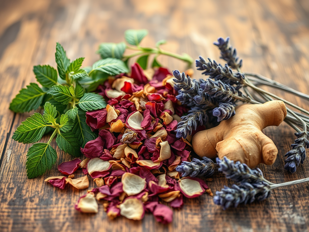 - Ginger – A warming herb that reduces nausea, supports digestion, and eases bloating.